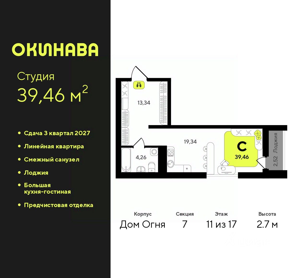 Однокомнатная квартира-студия от застройщика с предчистовой отделкой в ЖК ''Окинава'' на 11 этаже. Общая площадь: 39.46 кв.м., площадь гостиной 19.34 кв.м., из которых 5 кв.м. выделено под кухонную зону. Все окна выходят на одну сторону. В квартире одна лоджия, один совмещенный санузел. Высота потолков 2.7 м.