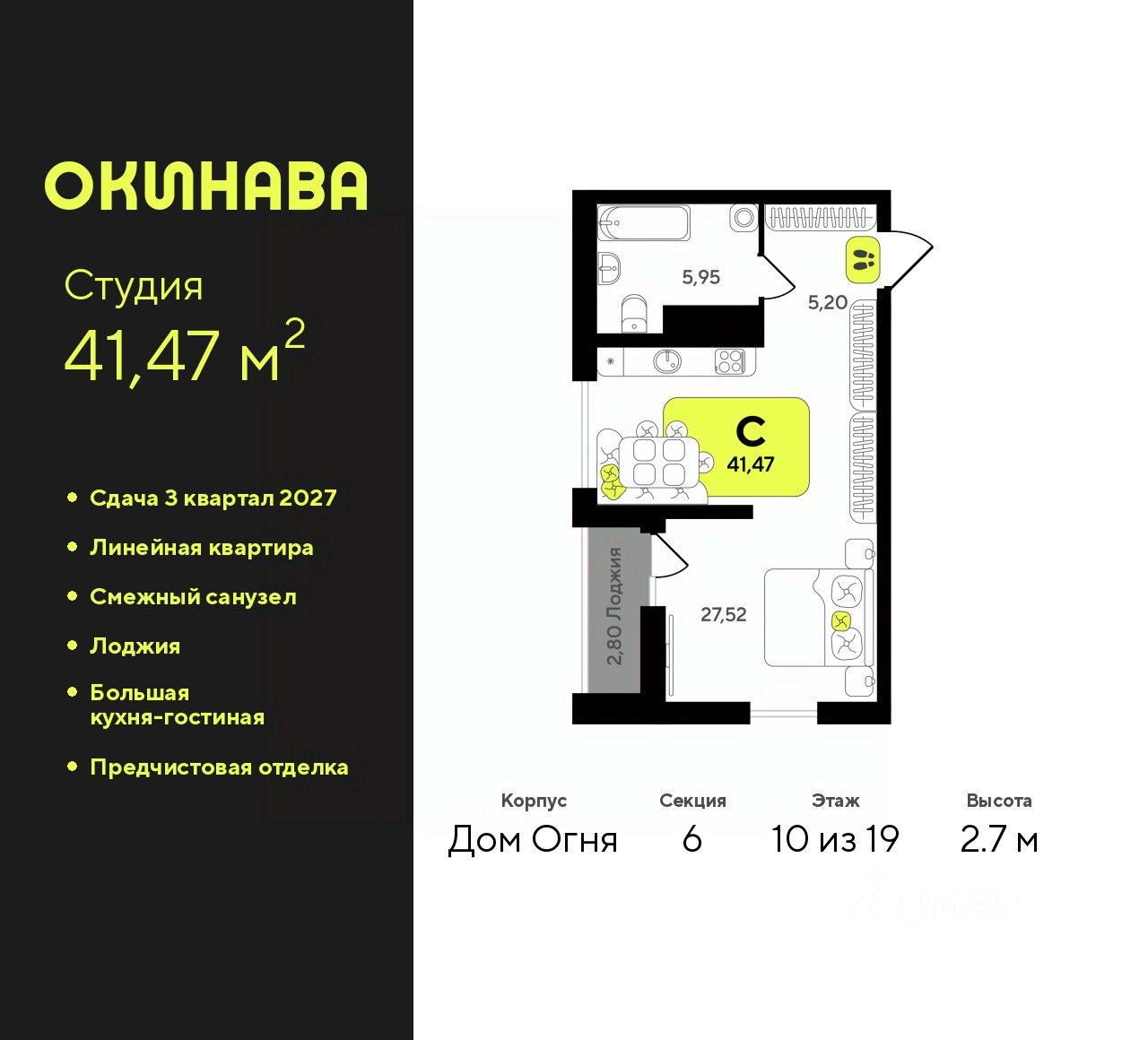 Продается 1-комн. квартира-студия с предчистовой отделкой в ЖК ''Окинава'' на 10 этаже. Общая площадь: 41.47 кв.м., площадь гостиной 27.52 кв.м., из которых 5 кв.м. выделено под кухонную зону. Все окна выходят на одну сторону. В квартире одна лоджия, один совмещенный санузел. Высота потолков 2.7 м.