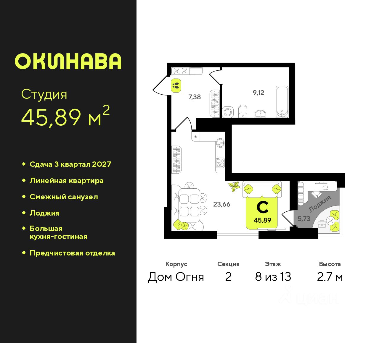 Продается однокомнатная квартира-студия с предчистовой отделкой в ЖК ''Окинава'' на 8 этаже. Общая площадь: 45.89 кв.м., площадь гостиной 23.66 кв.м., из которых 5 кв.м. выделено под кухонную зону. Все окна выходят на одну сторону. В квартире одна лоджия, один совмещенный санузел. Высота потолков 2.7 м.