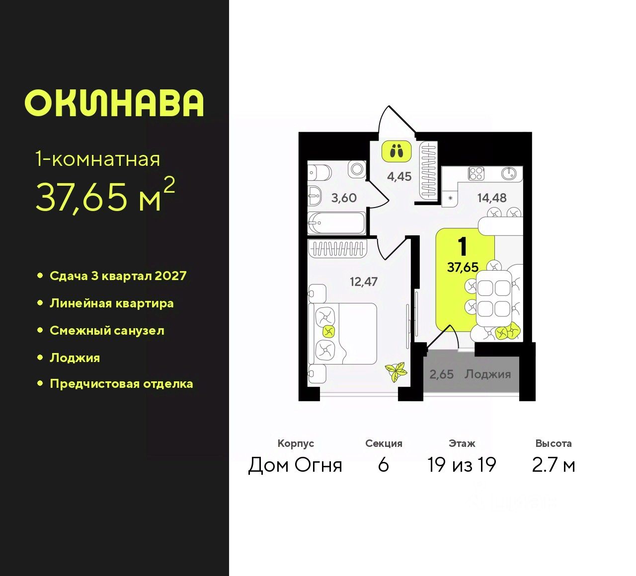 Просторная 1-комн. квартира с предчистовой отделкой в ЖК ''Окинава'' на 19 этаже. Общая площадь: 37.65 кв.м., жилая: 12.47 кв.м., площадь просторной кухни-столовой: 14.48 кв.м. Все окна выходят на одну сторону. В квартире одна лоджия, один совмещенный санузел. Высота потолков 2.7 м.