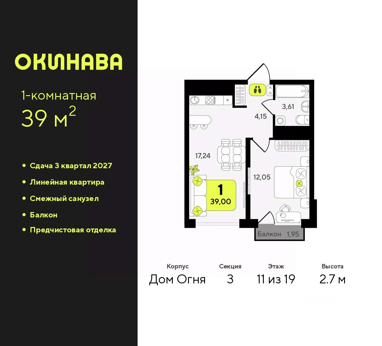 Продается 1-комн. квартира с предчистовой отделкой в ЖК ''Окинава'' на 11 этаже. Общая площадь: 39 кв.м., жилая: 12.05 кв.м., площадь просторной кухни-столовой: 17.24 кв.м. Все окна выходят на одну сторону. В квартире один балкон, один совмещенный санузел. Высота потолков 2.7 м.