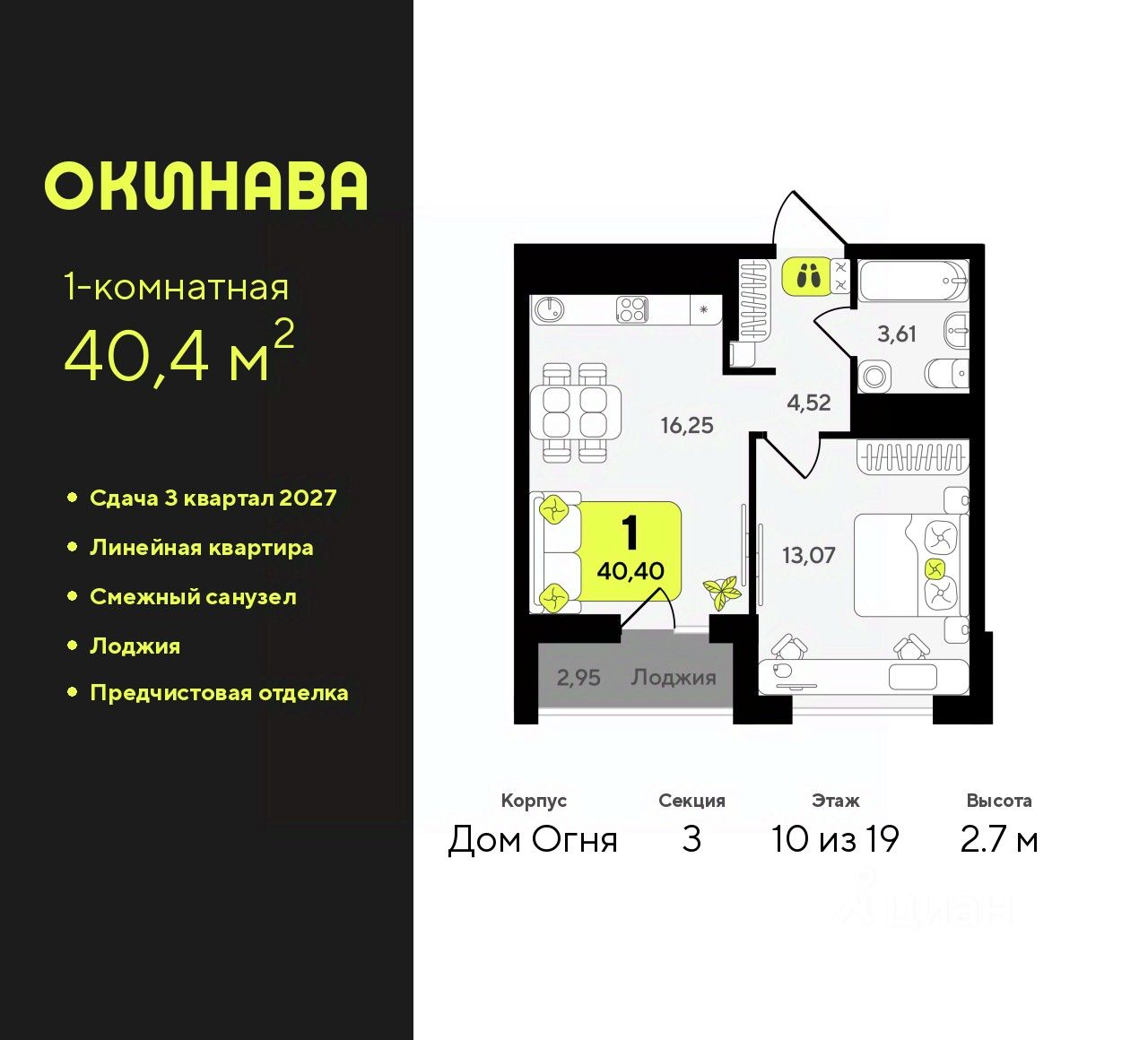 1-комн. квартира от застройщика с предчистовой отделкой в ЖК ''Окинава'' на 10 этаже. Общая площадь: 40.4 кв.м., жилая: 13.07 кв.м., площадь просторной кухни-столовой: 16.25 кв.м. Все окна выходят на одну сторону. В квартире одна лоджия, один совмещенный санузел. Высота потолков 2.7 м.