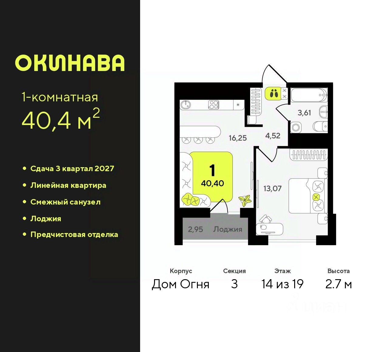 Просторная 1-комн. квартира с предчистовой отделкой в ЖК ''Окинава'' на 14 этаже. Общая площадь: 40.4 кв.м., жилая: 13.07 кв.м., площадь просторной кухни-столовой: 16.25 кв.м. Все окна выходят на одну сторону. В квартире одна лоджия, один совмещенный санузел. Высота потолков 2.7 м.