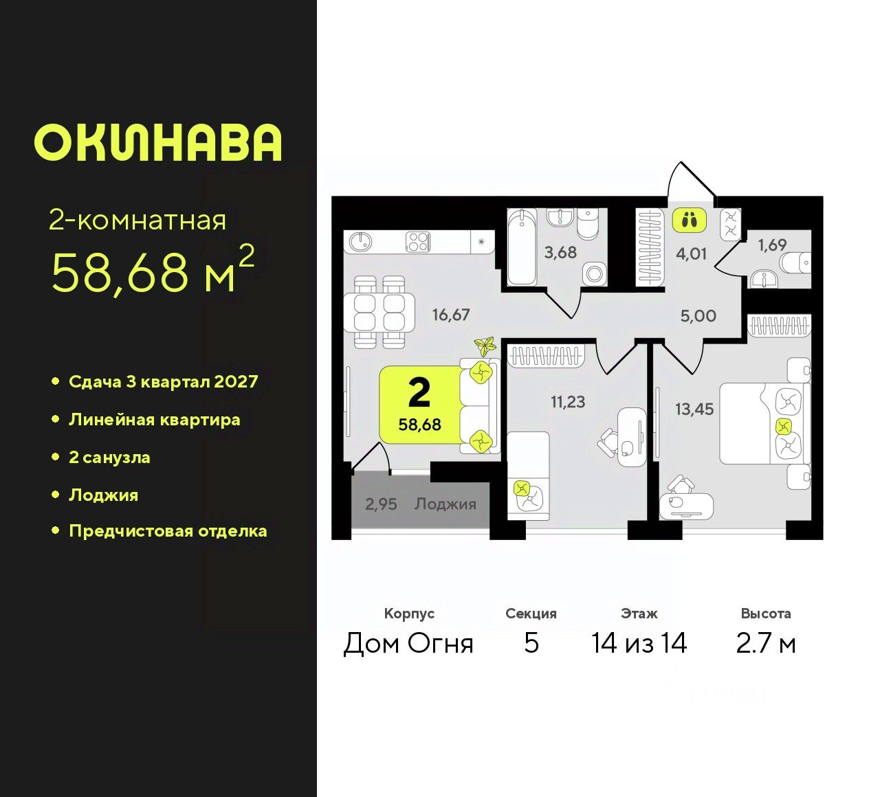 Продается двухкомнатная квартира с предчистовой отделкой в ЖК ''Окинава'' на 14 этаже. Общая площадь: 58.68 кв.м., жилая: 24.68 кв.м., площадь просторной кухни-столовой: 16.67 кв.м. Комнаты изолированные, все окна выходят на одну сторону. В квартире одна лоджия, один совмещенный и один раздельный санузел. Высота потолков 2.7 м.