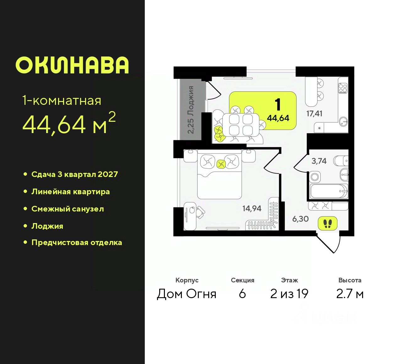 1-комн. квартира от застройщика с предчистовой отделкой в ЖК ''Окинава'' на 2 этаже. Общая площадь: 44.64 кв.м., жилая: 14.94 кв.м., площадь просторной кухни-столовой: 17.41 кв.м. Все окна выходят на одну сторону. В квартире одна лоджия, один совмещенный санузел. Высота потолков 2.7 м.
