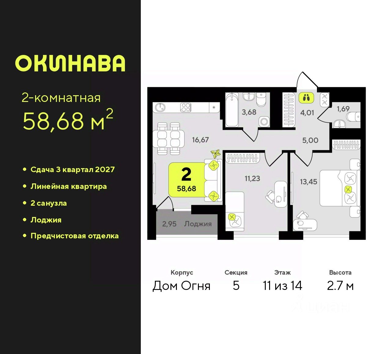2-комн. квартира с предчистовой отделкой в ЖК ''Окинава'' на 11 этаже. Общая площадь: 58.68 кв.м., жилая: 24.68 кв.м., площадь просторной кухни-столовой: 16.67 кв.м. Комнаты изолированные, все окна выходят на одну сторону. В квартире одна лоджия, один совмещенный и один раздельный санузел. Высота потолков 2.7 м.