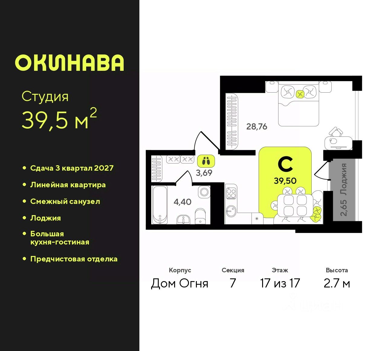 1-комн. квартира-студия с предчистовой отделкой в ЖК ''Окинава'' на 17 этаже. Общая площадь: 39.5 кв.м., площадь гостиной 28.76 кв.м., из которых 5 кв.м. выделено под кухонную зону. Все окна выходят на одну сторону. В квартире одна лоджия, один совмещенный санузел. Высота потолков 2.7 м.