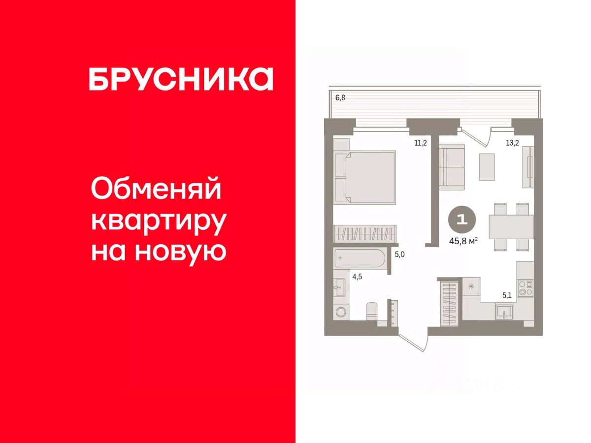 Квартира с кухней-гостиной и одной спальней в жилом районе ''Речной порт''. Особенности планировки: балкон, предчистовая отделка. квартиры в нашей базе: РП-07-1-1.8.2.