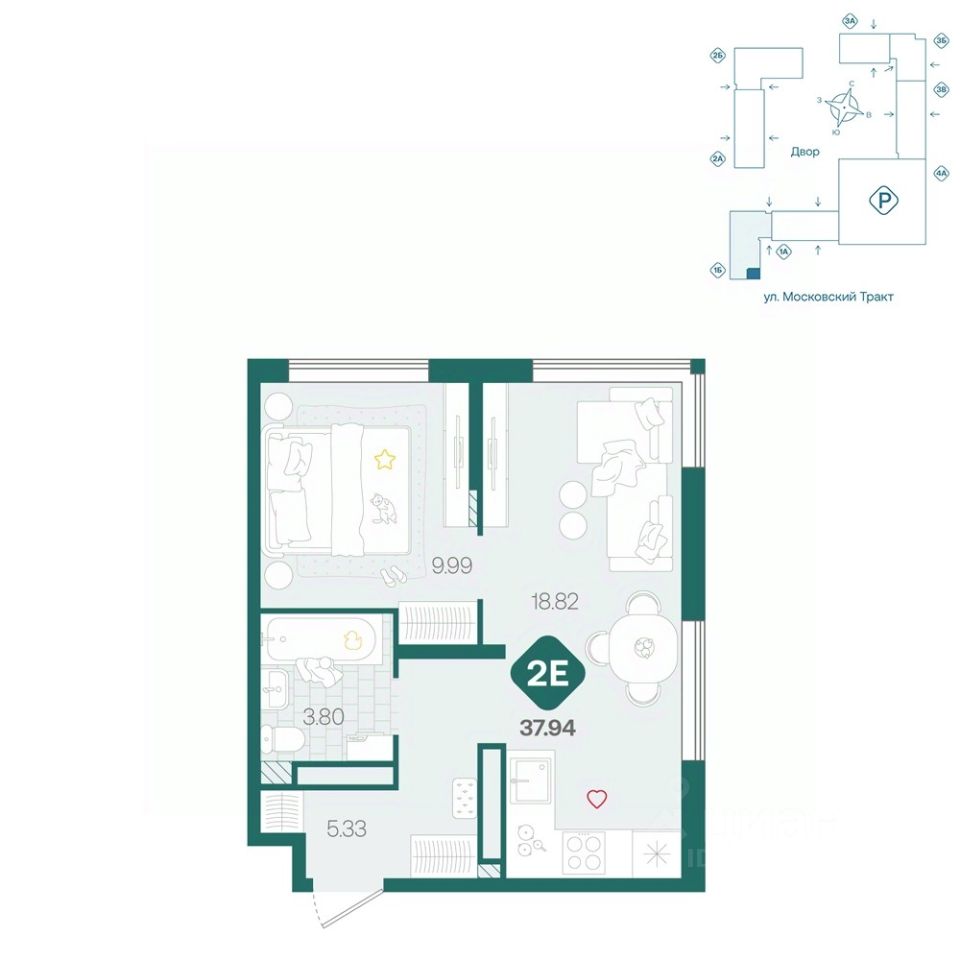 Однокомнатная квартира евроформата с большой кухней-гостиной, уютной спальней и вместительной ванной комнатой. В прихожей ниша под шкаф. Предусмотрено угловое остекление.