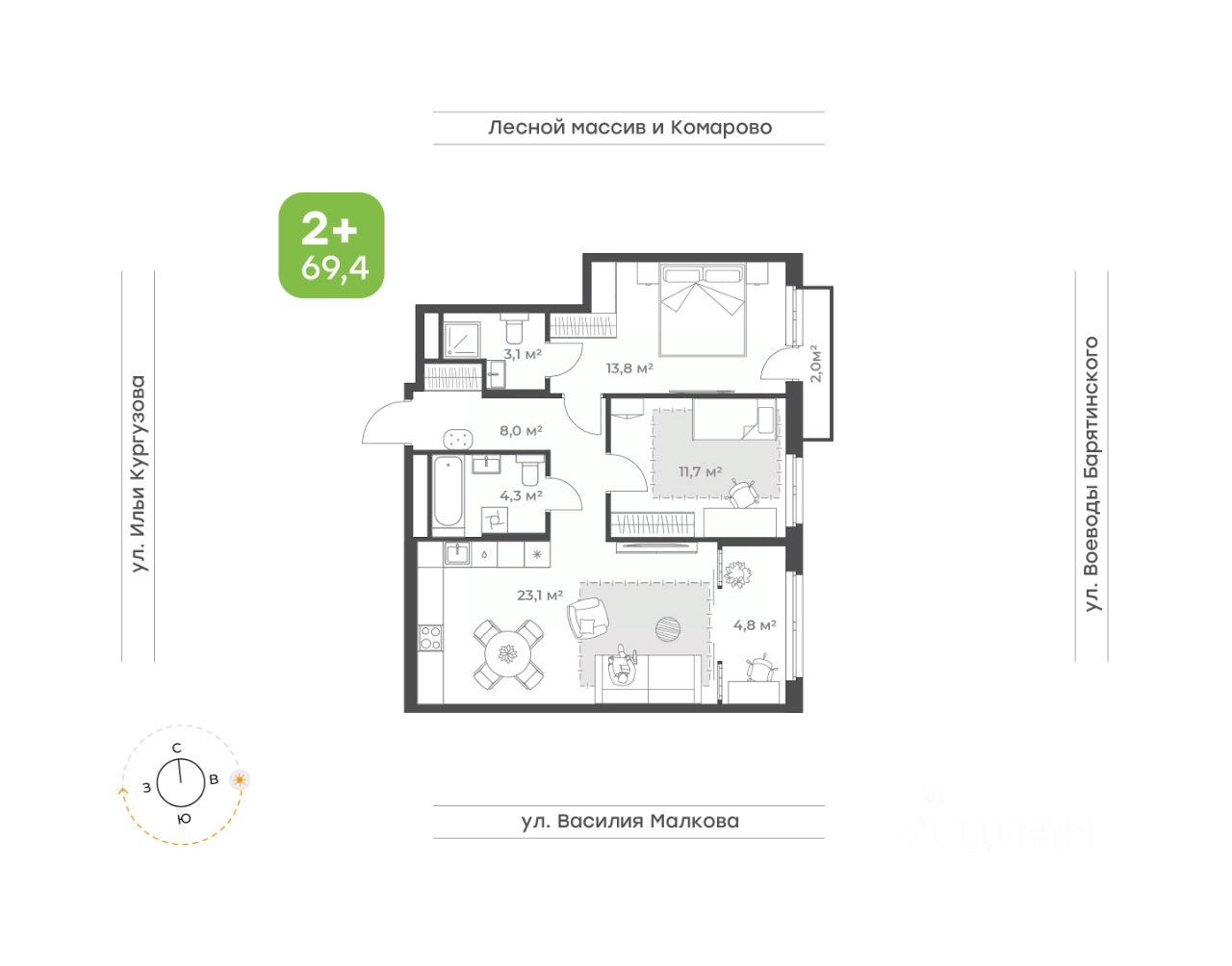 Квартира 2+ с видом на сквер!