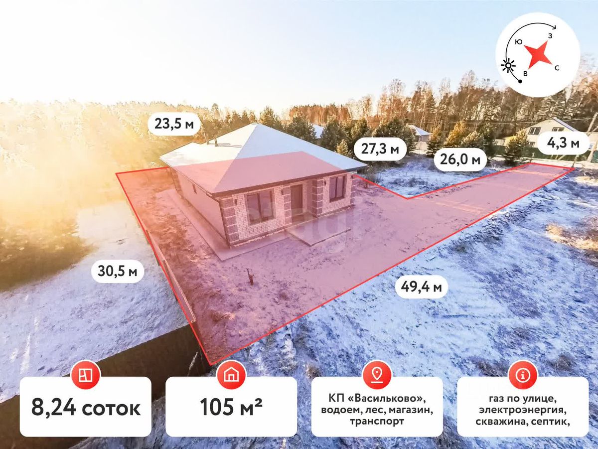 Расположение: Коттеджный посёлок ''Васильково'', всего 30 минут от города. Земля ИЖС. О доме: 105м2: совмещённая кухня-гостиная, ТРИ изолированные спальни, котельная, санузел,коридор и высокие потолки. Участок: Ухоженная территория со взрослыми елками, создающими потрясающий вид и уединённую атмосферу. Коммуникации: Полная автономия и комфорт — септик, скважина, электрокотел (экономное отопление). Мягкая кровля. Качество: Построен из экологически чистых материалов с облицовкой из кирпича. Финансирование: Доступна семейная ипотека под 6% годовых.