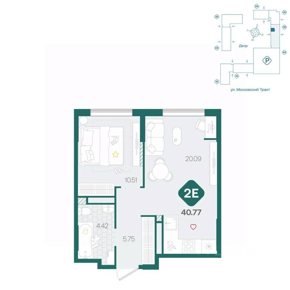 Двухкомнатная квартира с большой кухней более 20м² с удобным зонированием на четыре зоны: для приготовления, обеда, отдыха и работы. В отдельной спальне и прихожей предусмотрены ниши для хранения одежды. В санузле достаточно места для стиральнйо и сушильной машин.