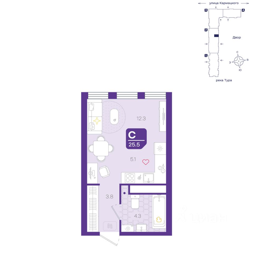 Уютная студия обладает правильной геометрией, что позволяет максимально эффективно использовать пространство.