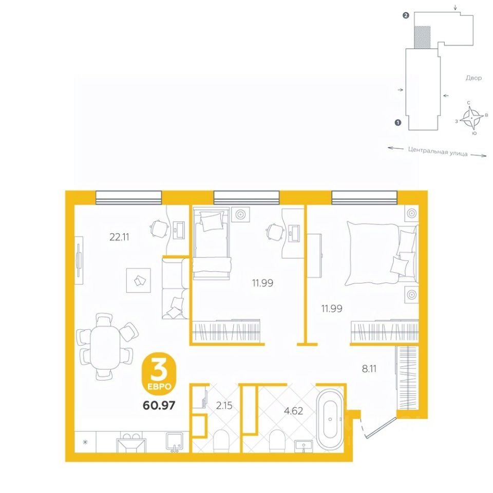 Площадь квартиры 60.97 м2 . Высота потолка 2,7 м.