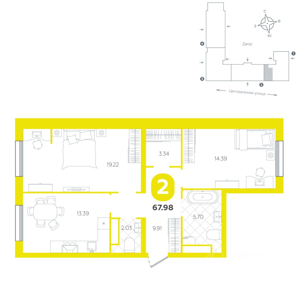 Квартира оснащена двумя санузлами, что существенно упрощает повседневные дела и совместное проживание. Окна квартиры выходят на две стороны, что создает светлую и воздушную атмосферу, наполняя пространство солнечным светом в течение всего дня.