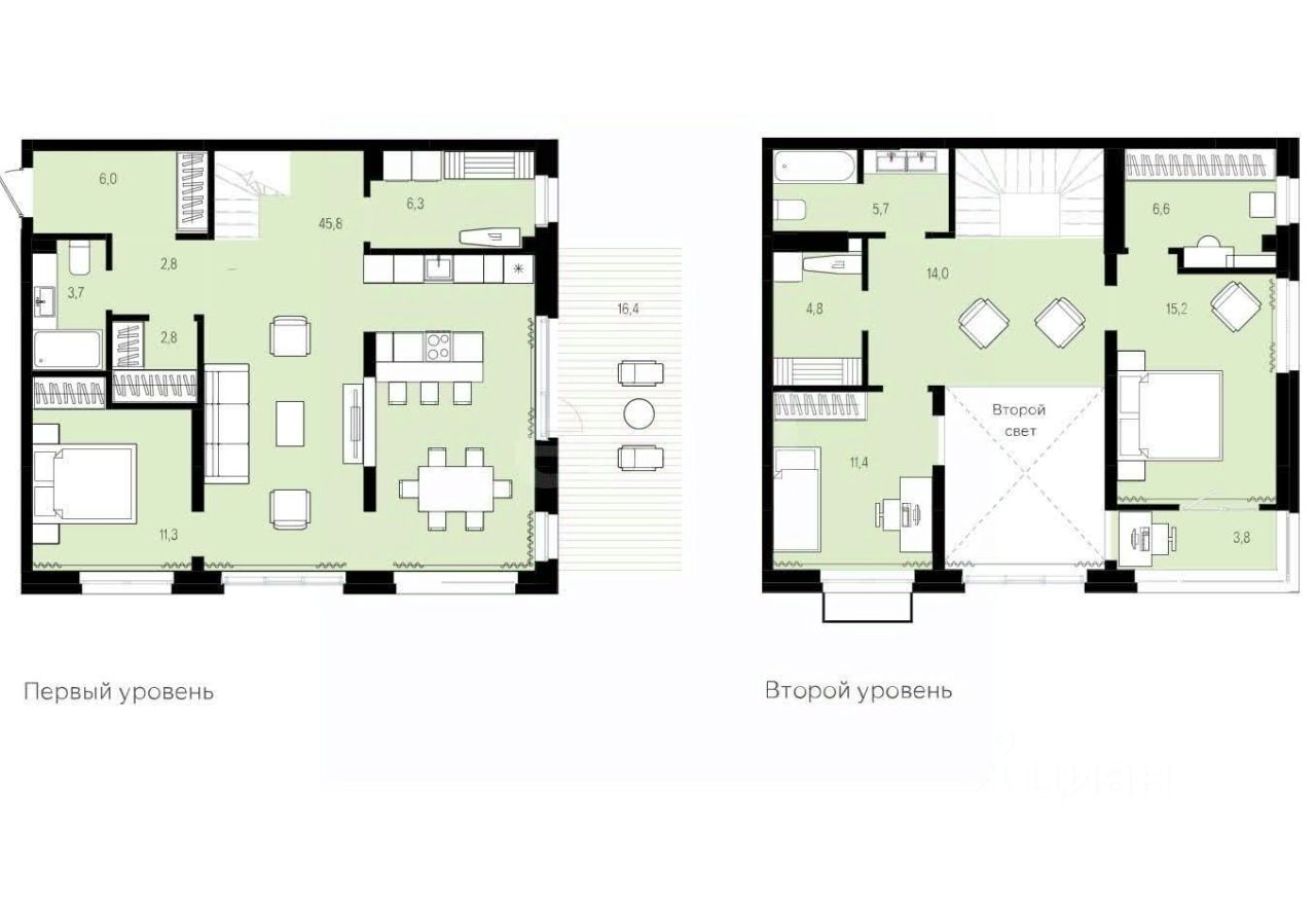 Это идеальный выбор для семьи: три спальни, просторная кухня-гостиная, два санузла, гардеробные, постирочные и терраса с выходом во внутренний зелёный двор.