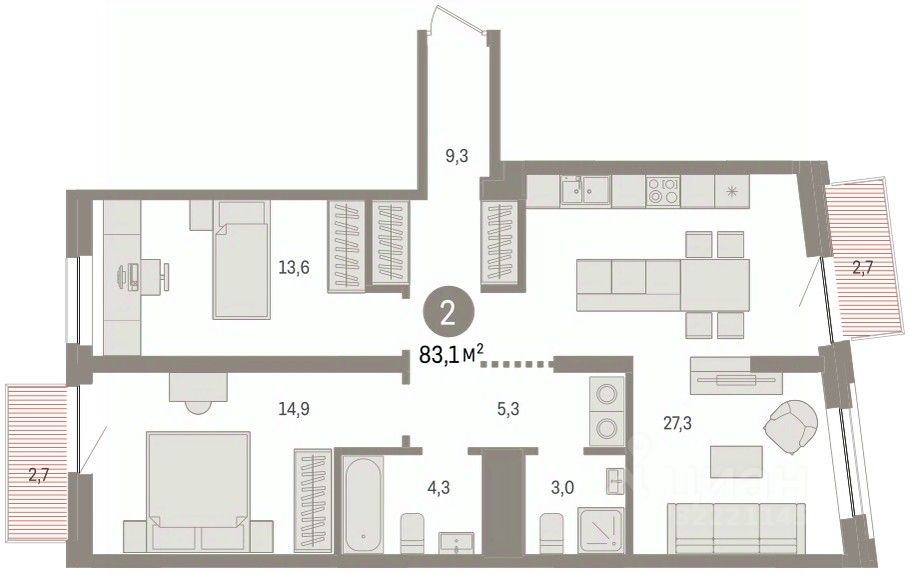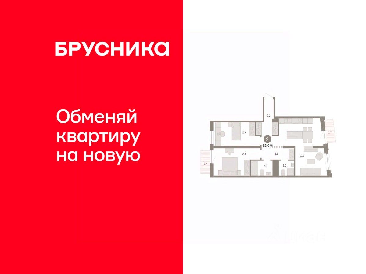 Квартира с кухней-гостиной и двумя спальнями в жилом районе ''Речной порт''. Особенности планировки: балкон, предчистовая отделка. квартиры в нашей базе: РПТ04-Ж1.5.6.