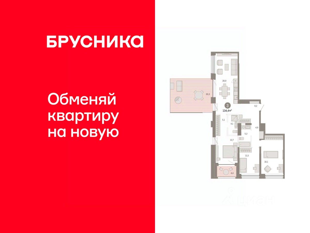 Просторная 3-комн. квартира с предчистовой отделкой в ЖК ''Дом у озера'' на 5 этаже. Общая площадь: 134.4 кв.м. Высота потолков 2.7 м.