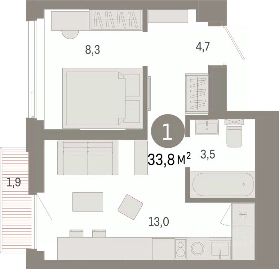 Однокомнатная квартира от застройщика с предчистовой отделкой в ЖК ''Зарека'' на 19 этаже. Общая площадь: 33.78 кв.м., жилая: 8.3 кв.м., площадь просторной кухни-гостиной: 13 кв.м. Все окна выходят на одну сторону. В квартире один балкон, один совмещенный санузел. Высота потолков 2.7 м.