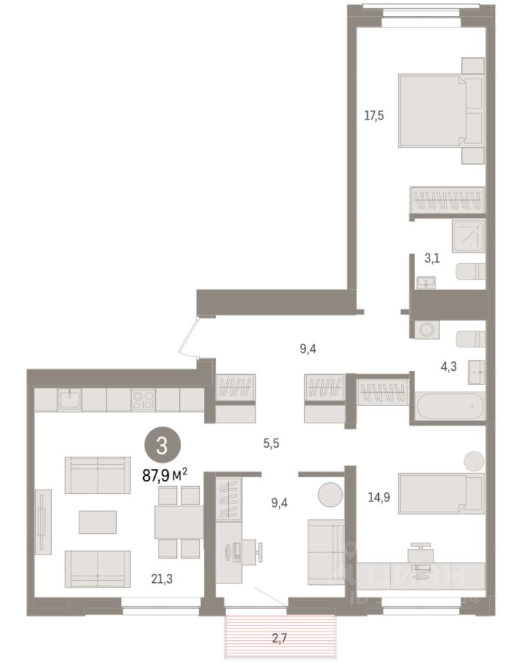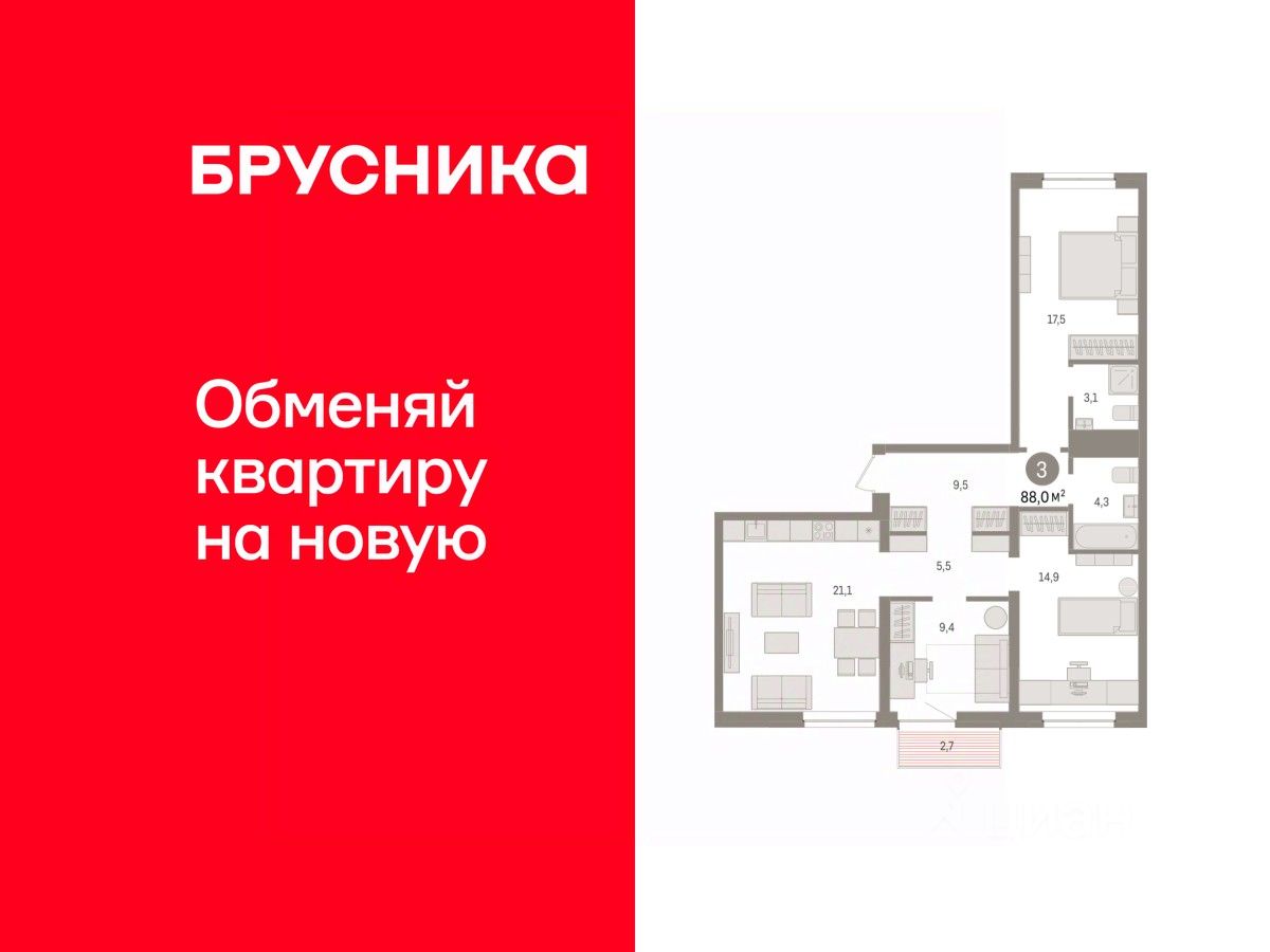 Продаётся с паркингом. Квартира с кухней-гостиной и тремя спальнями в жилом районе ''Речной порт''. Особенности планировки: балкон, предчистовая отделка, разнесённые спальни. квартиры в нашей базе: РПТ04-Ж7.9.5.