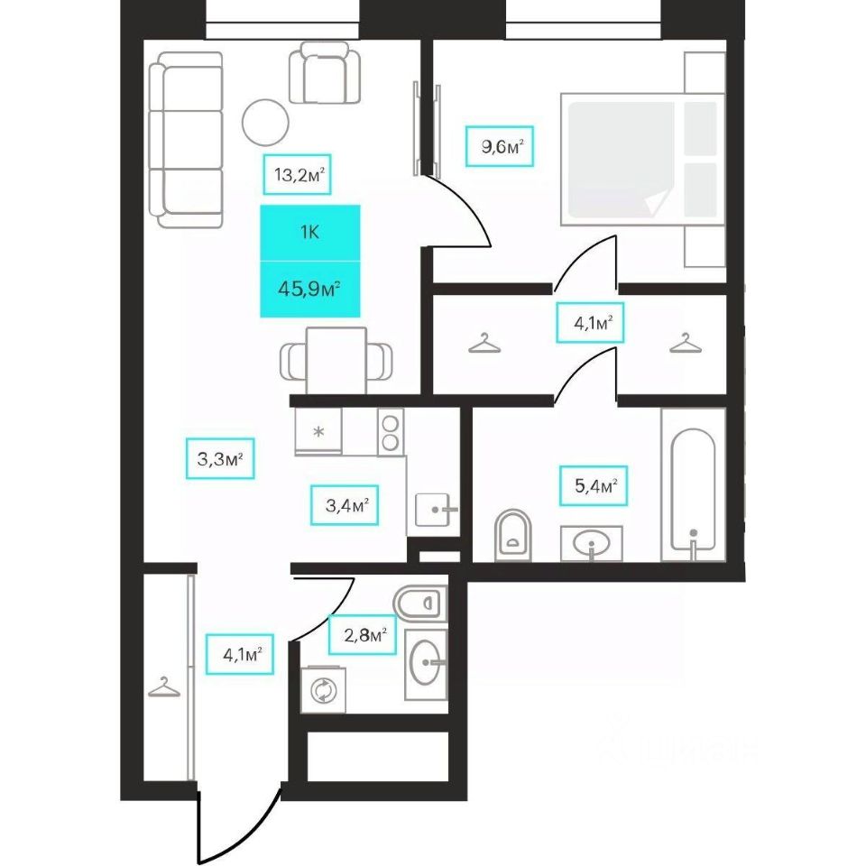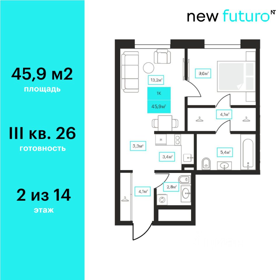 Продаётся 1-комнатная квартира в строящемся доме (Дом 6к2), срок сдачи: III-кв. 2026, общей площадью 45.9 кв.м., на 2 этаже. Новый жилой комплекс ''Futuro'' от застройщика ''newton'' расположен в г. Тюмень на Ставропольской улице.