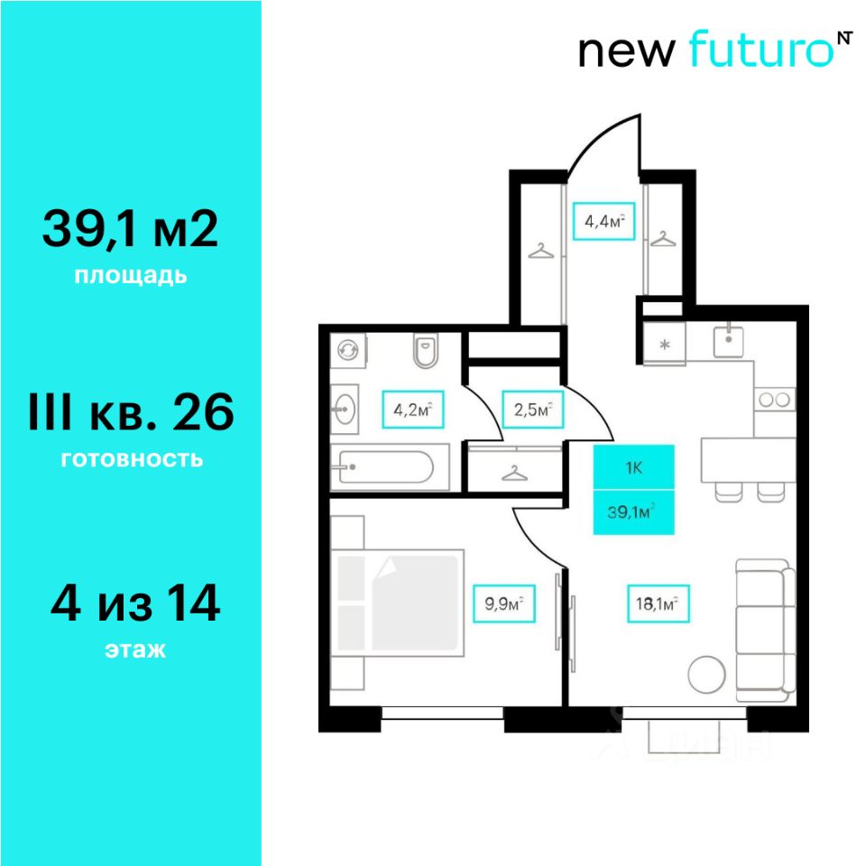 Продаётся 1-комнатная квартира в строящемся доме (Дом 6к2), срок сдачи: III-кв. 2026, общей площадью 39.1 кв.м., на 4 этаже. Новый жилой комплекс ''Futuro'' от застройщика ''newton'' расположен в г. Тюмень на Ставропольской улице.