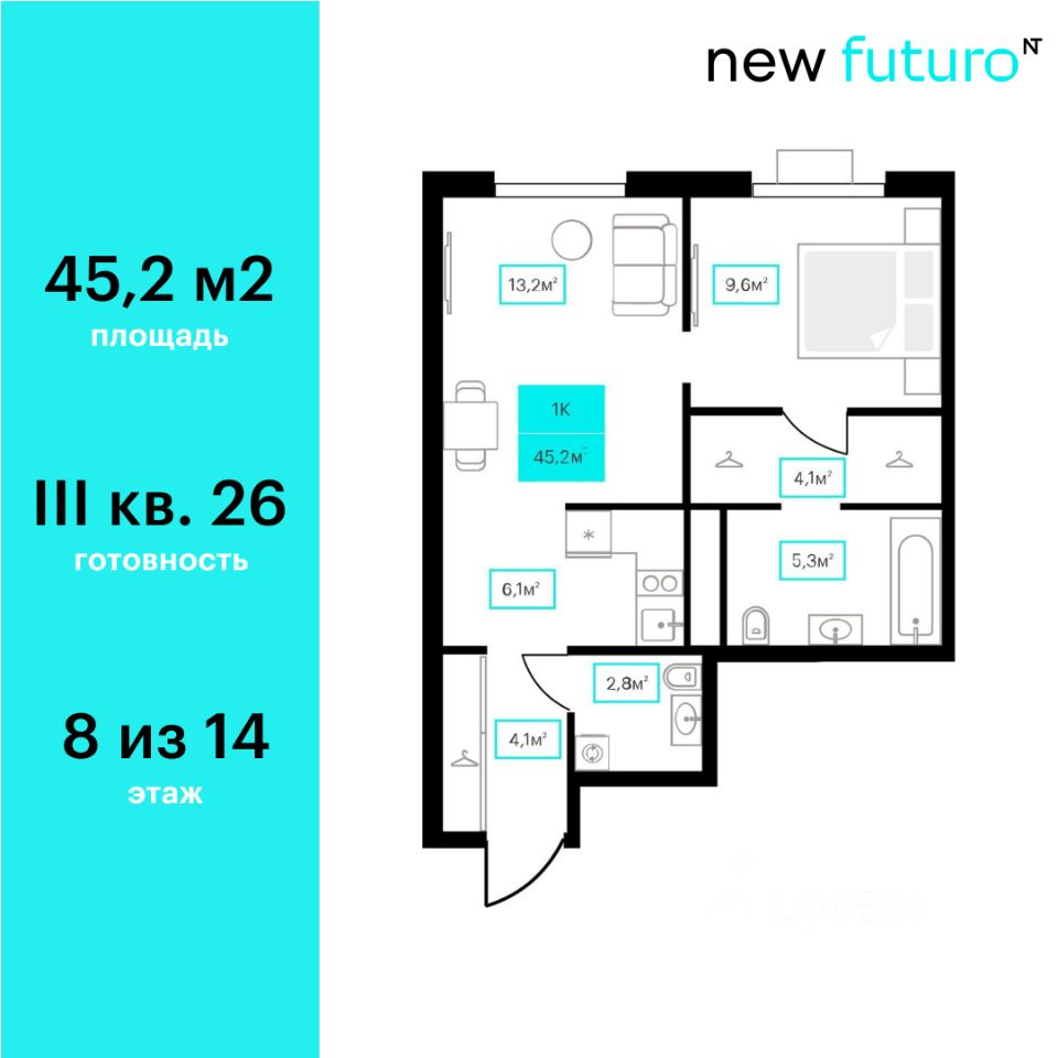 Продаётся 1-комнатная квартира в строящемся доме (Дом 6к2), срок сдачи: III-кв. 2026, общей площадью 45.2 кв.м., на 8 этаже. Новый жилой комплекс ''Futuro'' от застройщика ''newton'' расположен в г. Тюмень на Ставропольской улице.