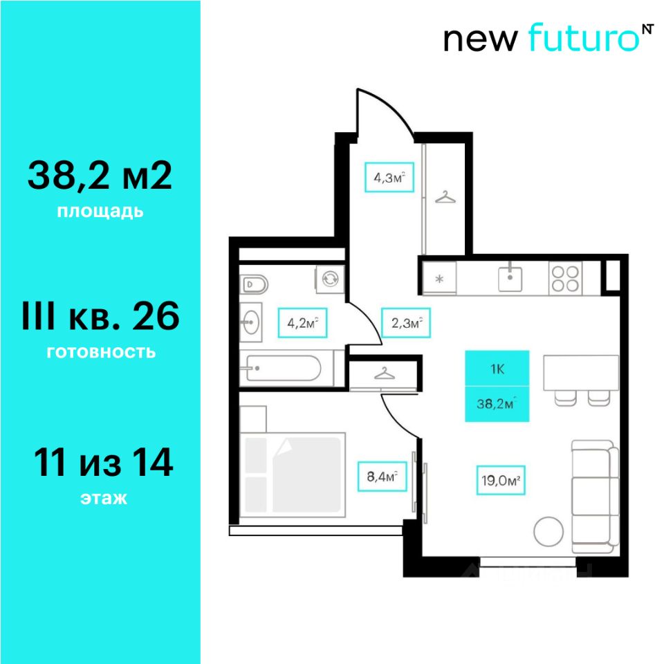 Продаётся 1-комнатная квартира в строящемся доме (Дом 6к2), срок сдачи: III-кв. 2026, общей площадью 38.2 кв.м., на 11 этаже. Новый жилой комплекс ''Futuro'' от застройщика ''newton'' расположен в г. Тюмень на Ставропольской улице.