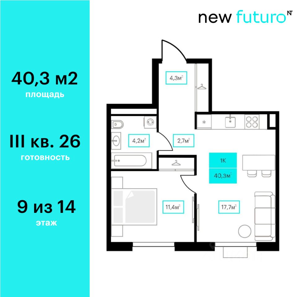 Продаётся 1-комнатная квартира в строящемся доме (Дом 6к2), срок сдачи: III-кв. 2026, общей площадью 40.3 кв.м., на 9 этаже. Новый жилой комплекс ''Futuro'' от застройщика ''newton'' расположен в г. Тюмень на Ставропольской улице.