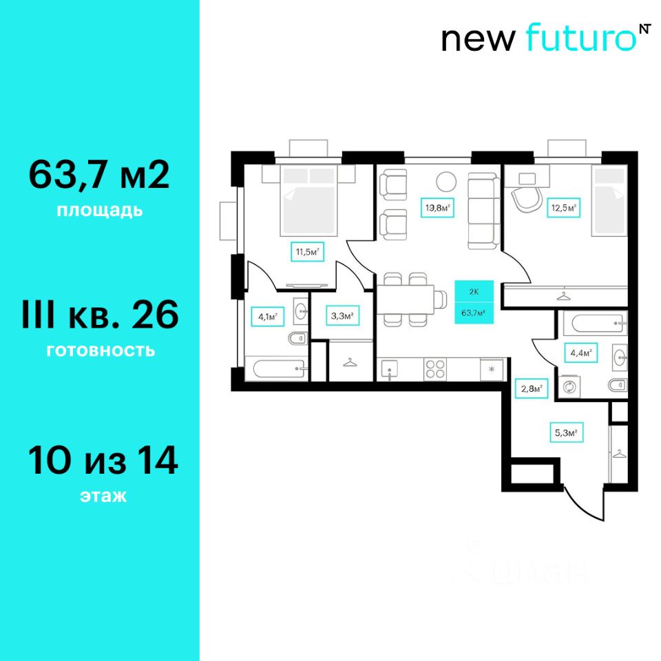 Продаётся 2-комнатная квартира в строящемся доме (Дом 6к2), срок сдачи: III-кв. 2026, общей площадью 63.7 кв.м., на 10 этаже. Новый жилой комплекс ''Futuro'' от застройщика ''newton'' расположен в г. Тюмень на Ставропольской улице.
