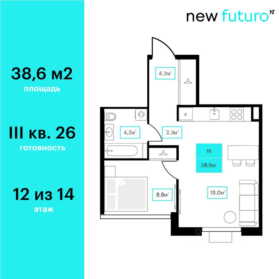 Продаётся 1-комнатная квартира в строящемся доме (Дом 6к2), срок сдачи: III-кв. 2026, общей площадью 38.6 кв.м., на 12 этаже. Новый жилой комплекс ''Futuro'' от застройщика ''newton'' расположен в г. Тюмень на Ставропольской улице.