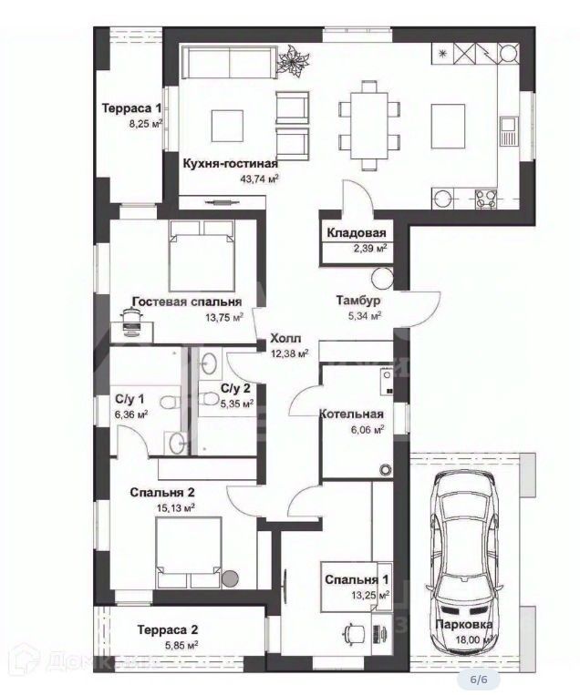 Выразительная архитектура проекта и 3 просторные комнаты и огромная кухня-гостиная удовлетворят потребности любой семьи. Изюминкой проекта является парковочное место под общей крышей с домом.