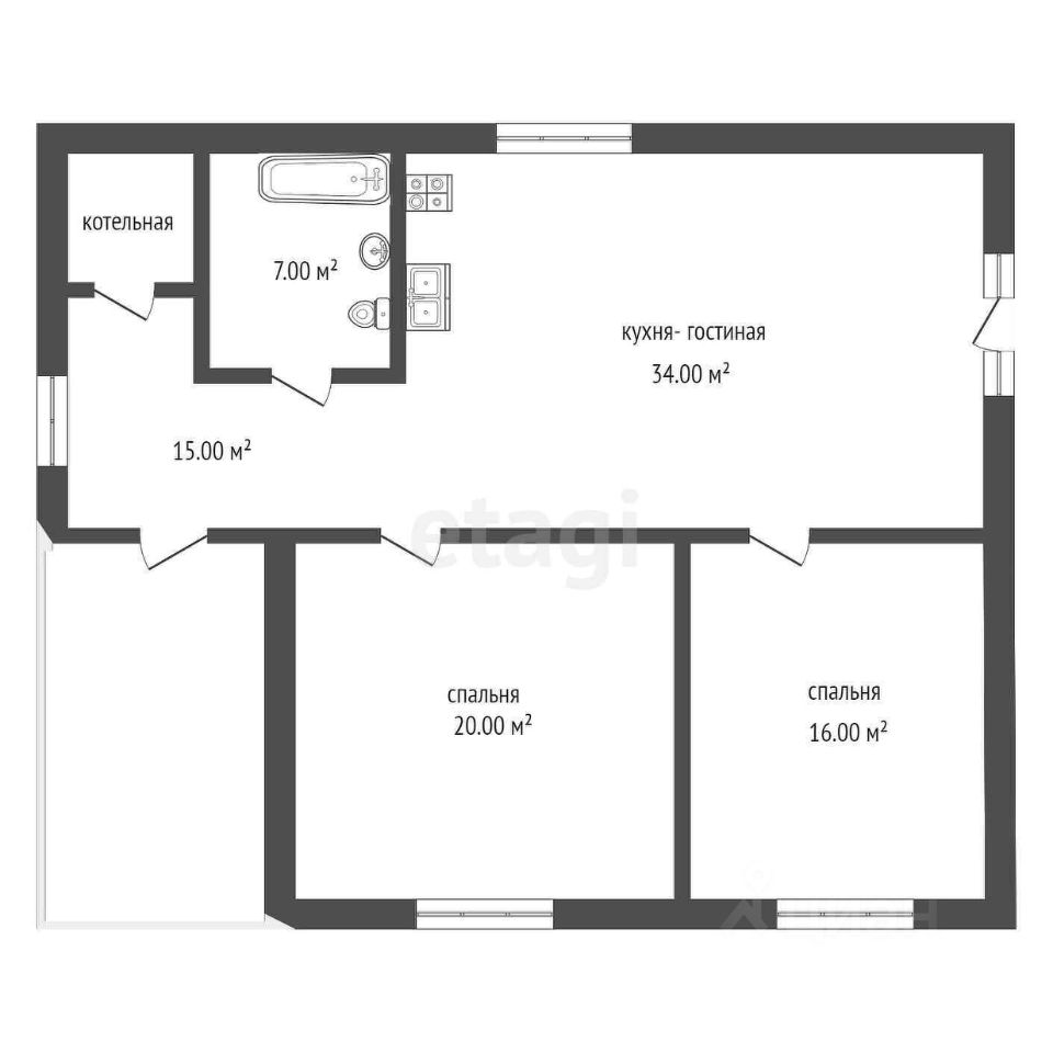 В доме: - 2 комнаты - кухня-гостиная - котельная - большой совмещенный санузел