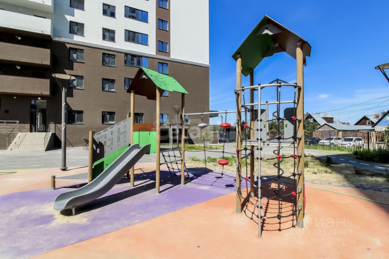 Шикарная современная детская площадка и площадка со спортивным инвентарём. Достаточно много парковочных мест по всему периметру.