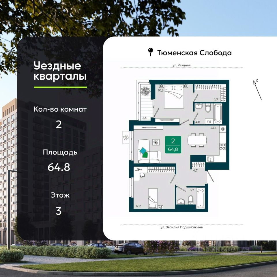 2-комн. квартира с предчистовой отделкой в ЖК ''Уездные кварталы'' на 3 этаже. Общая площадь: 64.8 кв.м., жилая: 22.5 кв.м., площадь просторной кухни-столовой: 23.5 кв.м. Комнаты изолированные, все окна выходят на одну сторону. В квартире одна лоджия, два совмещенных санузла. Высота потолков 2.72 м.