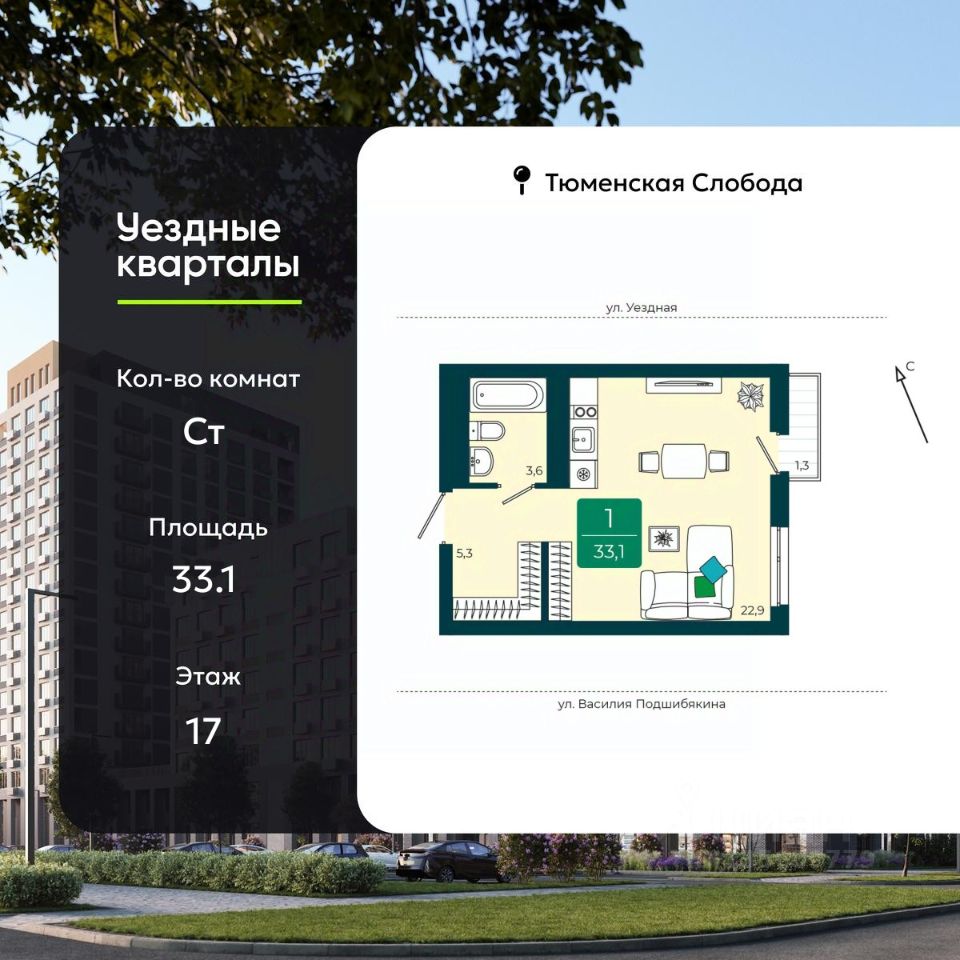 Однокомнатная квартира-студия в ЖК ''Уездные кварталы'' на 17 этаже. Квартира без отделки, после получения ключей можно делать ремонт. Общая площадь: 33.1 кв.м., площадь гостиной 22.9 кв.м., из которых 5 кв.м. выделено под кухонную зону. Все окна выходят на одну сторону. В квартире один балкон, один совмещенный санузел. Высота потолков 2.72 м.