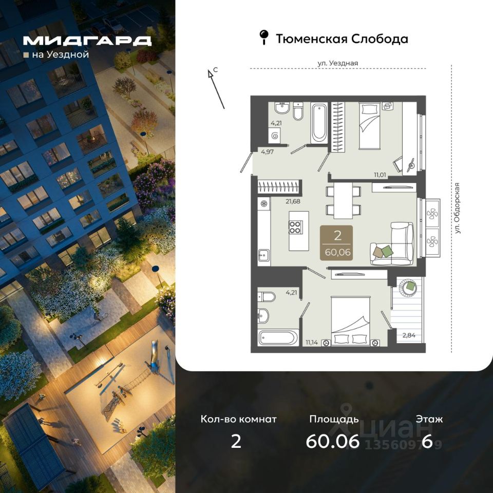 2-комн. квартира от застройщика в ЖК ''Мидгард на Уездной'' на 6 этаже. Квартира без отделки, полностью готова к чистовой отделке и дальнейшему ремонту. Общая площадь: 60.06 кв.м., жилая: 22.15 кв.м., площадь просторной кухни-столовой: 21.68 кв.м. Комнаты изолированные, все окна выходят на одну сторону. В квартире одна лоджия, два совмещенных санузла. Высота потолков 2.72 м.