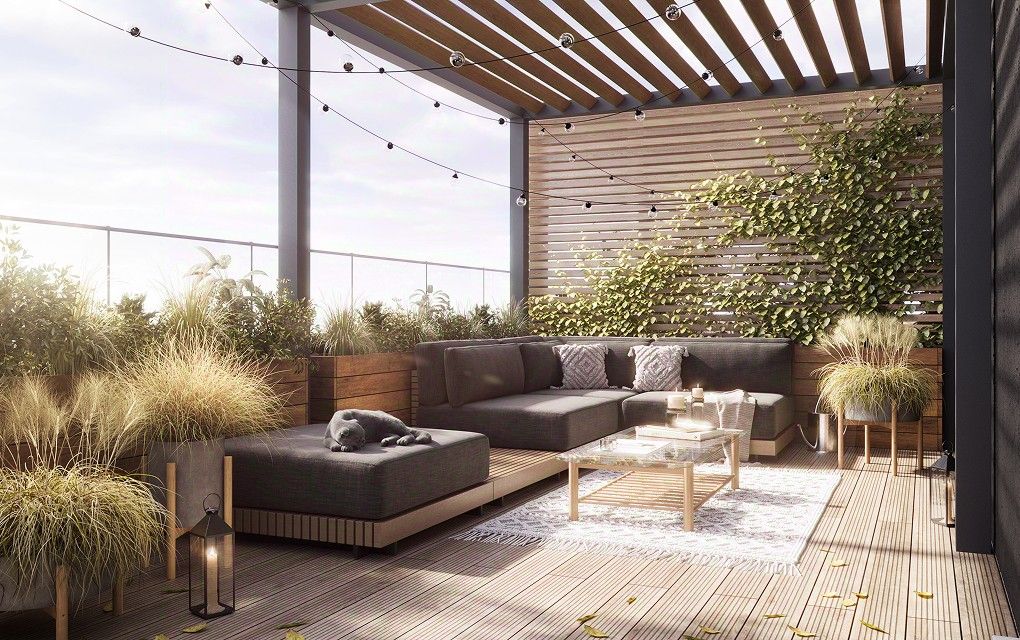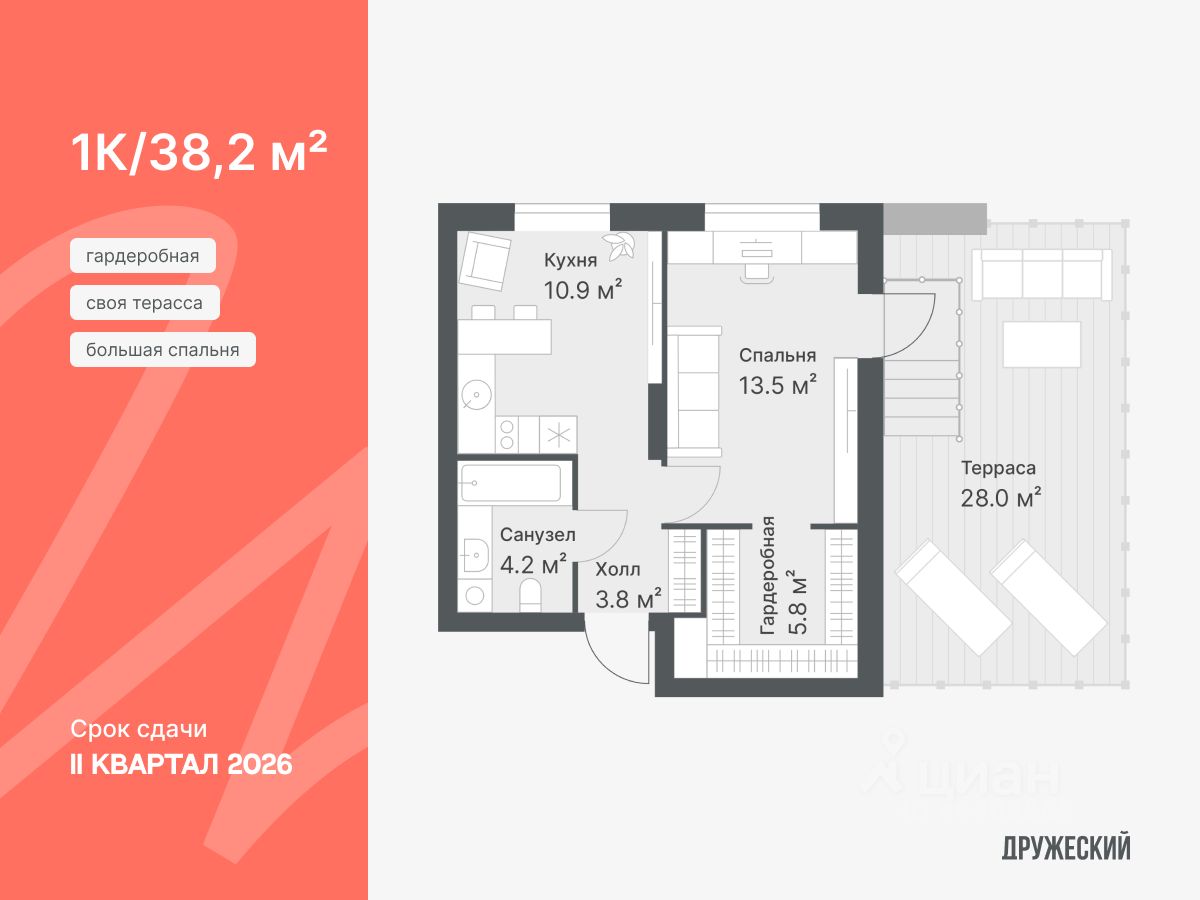 Планировка однокомнатная. В спальне есть место не только для отдыха, но и для рабочей зоны. Здесь же выход на террасу — можете разместить там летнюю мебель и шезлонги, чтобы отдыхать на свежем воздухе, когда тепло. Приятный бонус — гардеробная в спальне.
