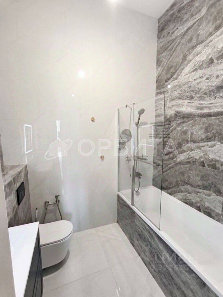 Современный санузел оборудован тёплыми полами и стильной отделкой. В квартире остаётся кухонный гарнитур, диван, стол и мебель в прихожей — можно сразу заезжать и жить.