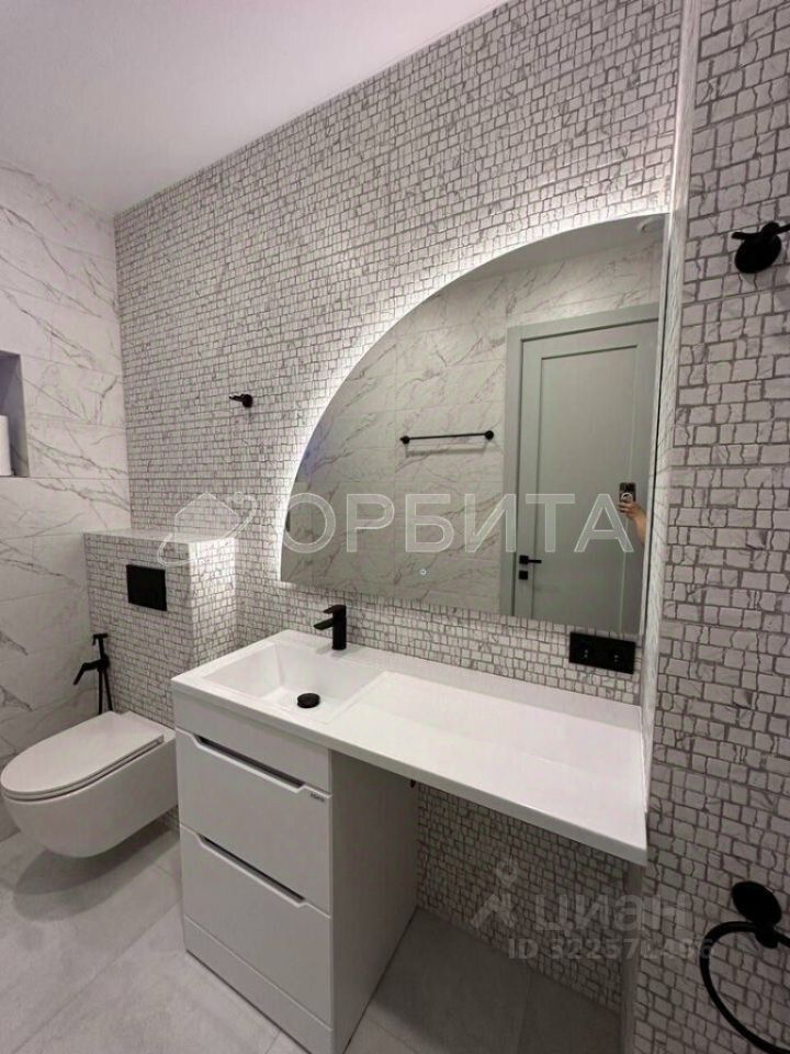 Второй санузел также оснащён современным безободковым унитазом подвесной системы, который экономит пространство и обеспечивает гигиеничность. Предусмотрен слив воды двумя режимами: для экономии и полного смыва. Гигиенический душ, раковина, дизайнерское зеркало и место для подключения стиральной машины делают санузел удобным и стильным. Два уровня подсветки и регулируемая тёплая стена создают приятную атмосферу.