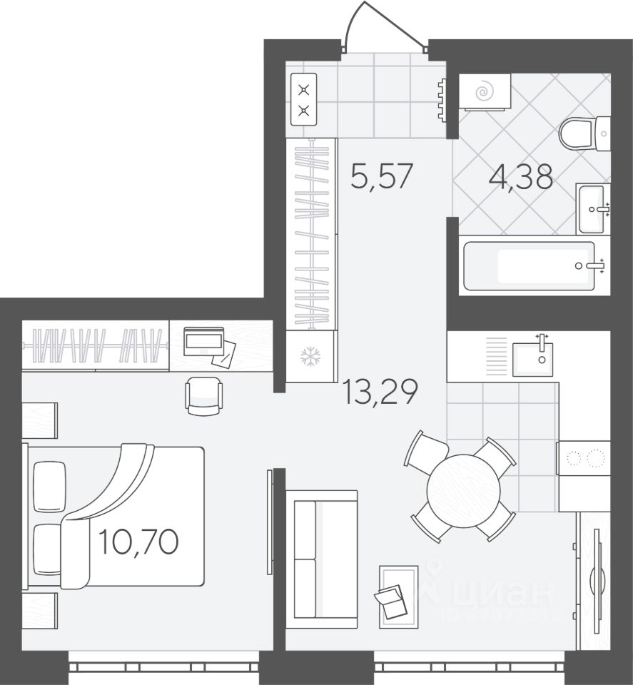 В квартире есть кухня-гостиная и отдельная спальня, предусмотрены ниши под шкафы-купе. Это позволяет оставить больше пространства для жизни.