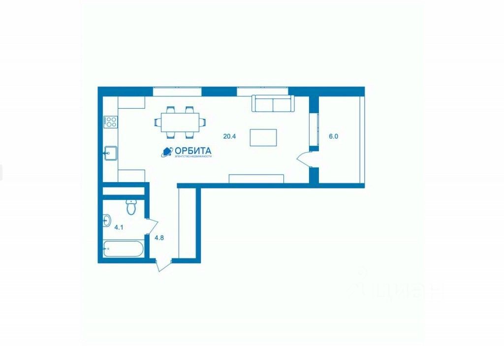 Просторная кухня-гостиная (22,8 кв.м.) правильной формы — отлично подходит для собираний всей семьи и приятных посиделок.