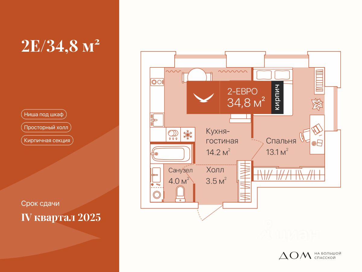 Квартира с просторной кухней-гостиной: есть место для готовки и отдыха. В спальне и холле ниши под хранение. Окна выходят на две стороны