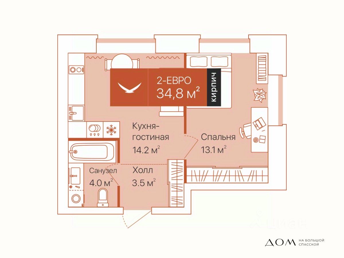 Квартира с просторной кухней-гостиной: есть место для готовки и отдыха. В спальне и холле ниши под хранение. Окна выходят на две стороны