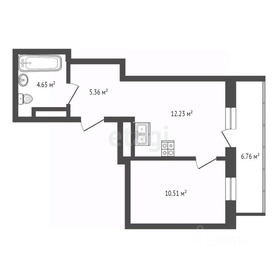 Кухня-гостиная 12,3 квадратных метров. Большая лоджия. Улучшенная черновая отделка, можно сразу приступать к ремонту.