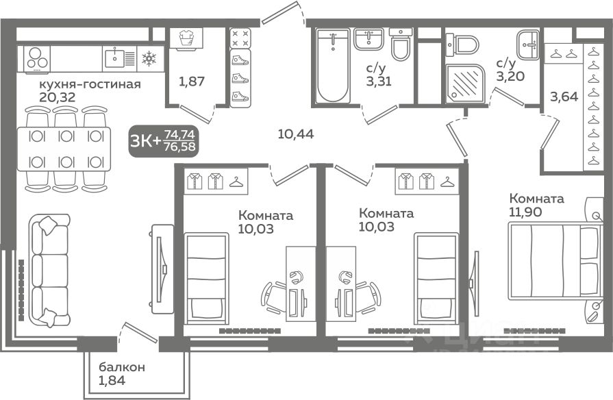Прямая продажа от застройщика! Продается трёхкомнатная квартира в строящемся ЖК ''Меридиан Слобода'', срок сдачи: I-кв. 2027, общей площадью 74.74 м², на 11 этаже из 21. Площадь кухни — 20.32 м².