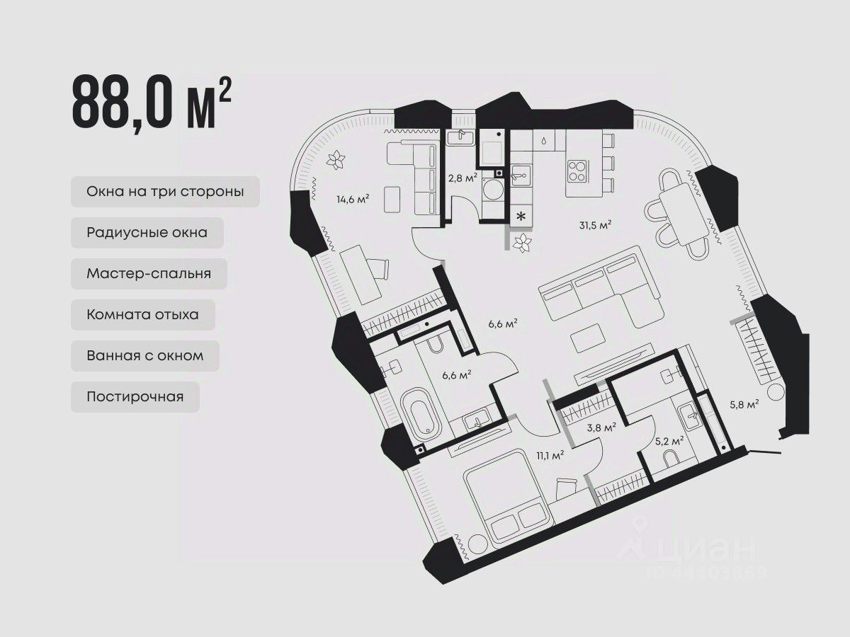 Высота окон — 2,4 метра, поэтому в комнаты проникает много естественного света. В детской и кухне-гостиной спроектированы радиусные окна для бесшовного обзора на две стороны.