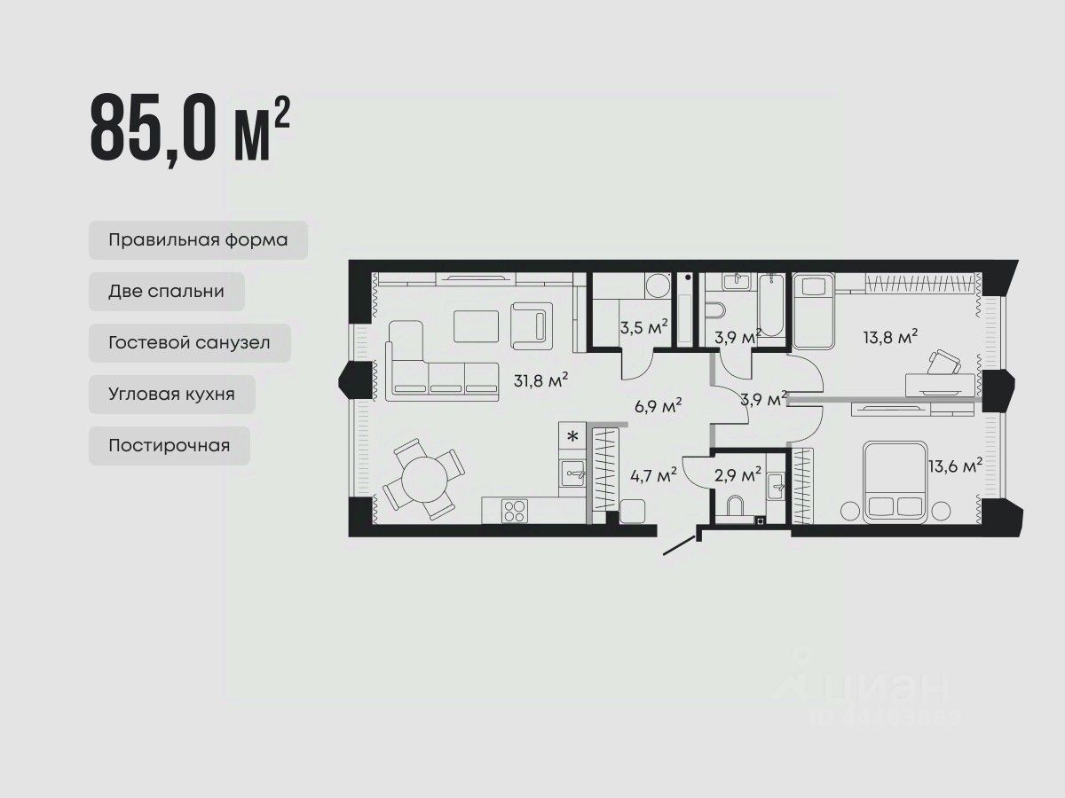 Экспозиционная планировка строго разделяет личное и общее пространство в квартире. Она предусматривает две спальни с выходом на балкон, просторную кухню-гостиную, дополнительный санузел и постирочную.