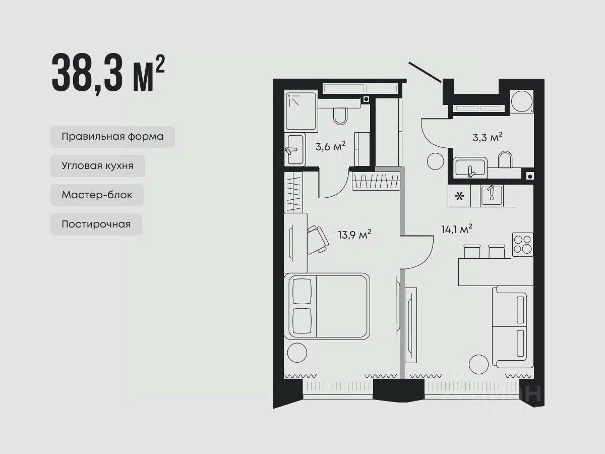 Планировка предусматривает мастер-спальню со сквозной гардеробной, кухню-гостиную с угловым гарнитуром и дополнительный санузел.