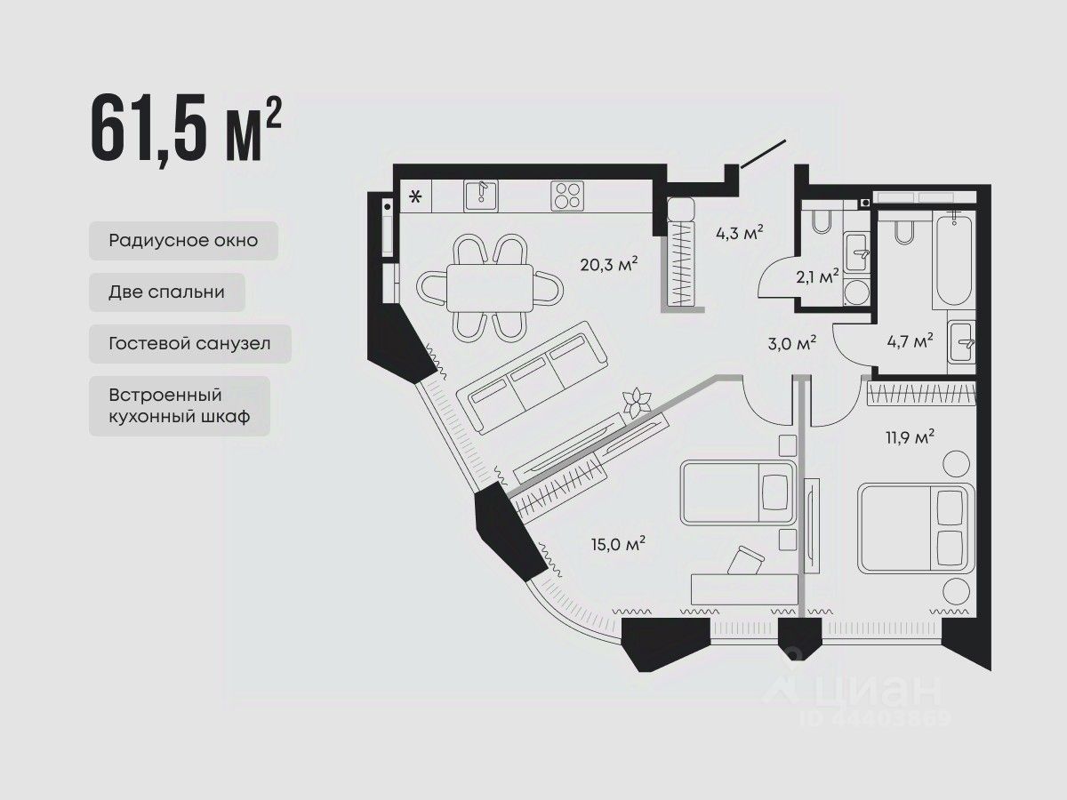 Планировка предусматривает две спальни с увеличенными окнами, просторную кухню-гостиную и дополнительный санузел.